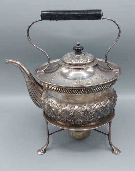 A Victorian silver spirt kettle with embossed decoration and ebonised handle complete with stand and burner, London 1890/91 markers Josiah Williams & Co, 30ozs. Hammer: £680