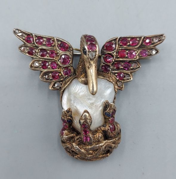 A brooch in the form of a swan with chicks, set with a central Pearl surrounded by Rubies and Diamonds, 3.5cms x 4cms. Hammer: £1,200