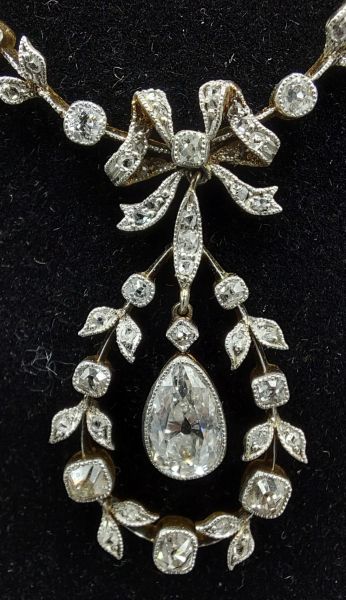 An Edwardian 18ct gold Belle Epoque Diamond necklace with a central pear shaped Diamond surrounded by Diamonds within a drop pendant with Diamond set bow above and with fine linked chain. Hammer £1850