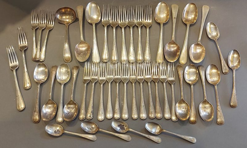 A George V silver canteen of flatware comprising six table forks, twelve dessert forks, eight dessert spoons, five table spoons, four teaspoons and a ladle, Sheffield 1921, maker Stevenson and Law together with five matched forks and three spoons, various dates, 96ozs Hammer £2200