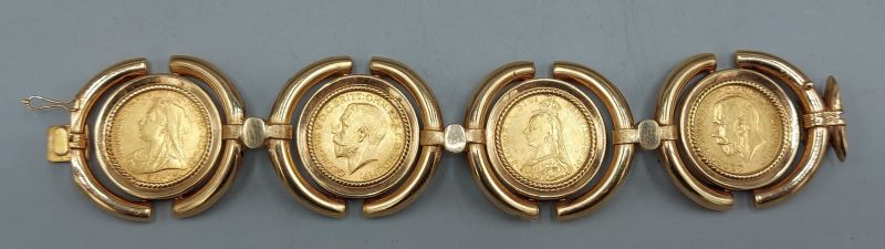 An 18ct gold bracelet set with four gold Sovereigns to include a George V Sovereign dated 1918, a Victorian Sovereign dated 1891, a George V Soverein dated 1927 and a Victorian Sovereign dated 1901, total weight 80.3gms. Hammer: £5200