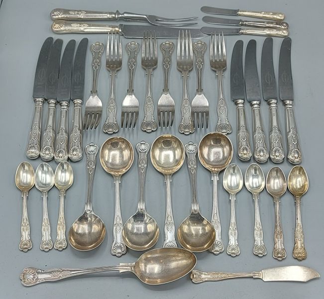 A Sheffield silver canteen of flatware comprising eight table forks, six soup spoons, one table spoon, seven teaspoons, a butter knife and eight silver handled table knives, three silver handled dessert knives and a pair of silver handled servers, various dates, 45ozs excluding knives and servers, maker Viners Ltd. Hammer £2,600