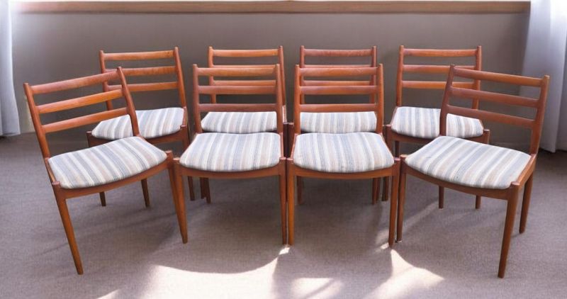 A set of eight Danish dining chairs, model 191, designed by Arne Vodder, each with a three curved rail back above an upholstered seat and turned legs. Hammer £1,250