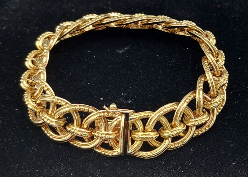 An 18ct gold bracelet of pierced linked form, 18cms long, 58gms Hammer £4,000