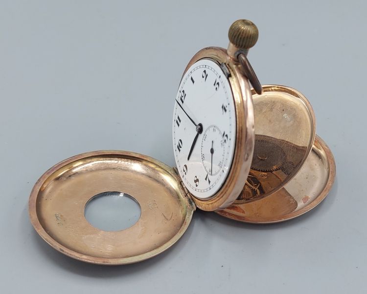 A 9ct gold Half Hunter pocket watch, the enamel dial with Arabic numerals and subsidiary seconds dial, 30.4gms excluding movement. Hammer: £750