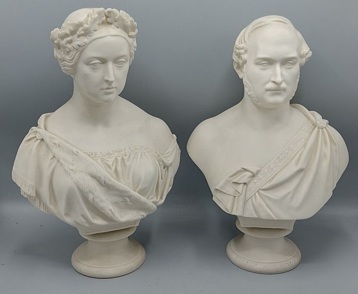 A pair of Copeland Parian ware busts by William Theed, Queen Victoria and Prince Albert, Ceramic and Crystal Palace Art Union pub Aug 1864, 34cms tall. Hammer £520