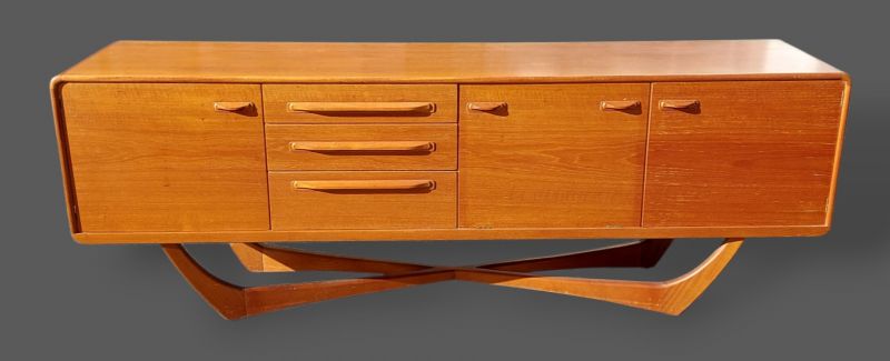 A Circa 1960's Symphony Teak sideboard by Val Rossi for Beithcraft with three doors and three drawers raised upon shaped legs with crossover stretcher, 205cms wide, 46cms deep and 73cms tall. Hammer £980