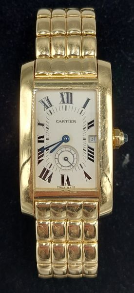 A Cartier 18ct gold Tank Americaine Gentlemans Wristwatch with quartz movement and 18ct gold bracelet. Hammer £5,800